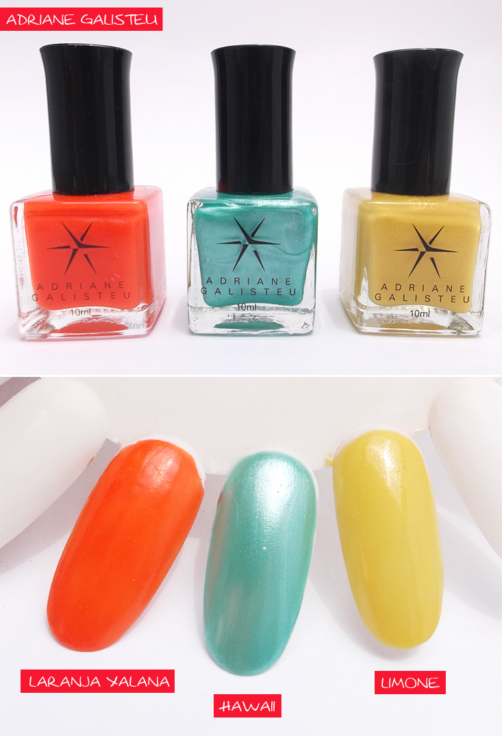 O Laranja Xalana é bastante vibrante e tem um pouco de neon na sua composição. Cobre bem com duas camadas e o acabamento é bem brilhoso. O Hawaii é um verde claro bem cintilante e fofo, mas que não fica com marcas de pincel ao ser aplicado. O Limone é um amarelo com algumas partículas de brilho dourado. Cobre bem com duas camadas e fica muito lindo na unha.